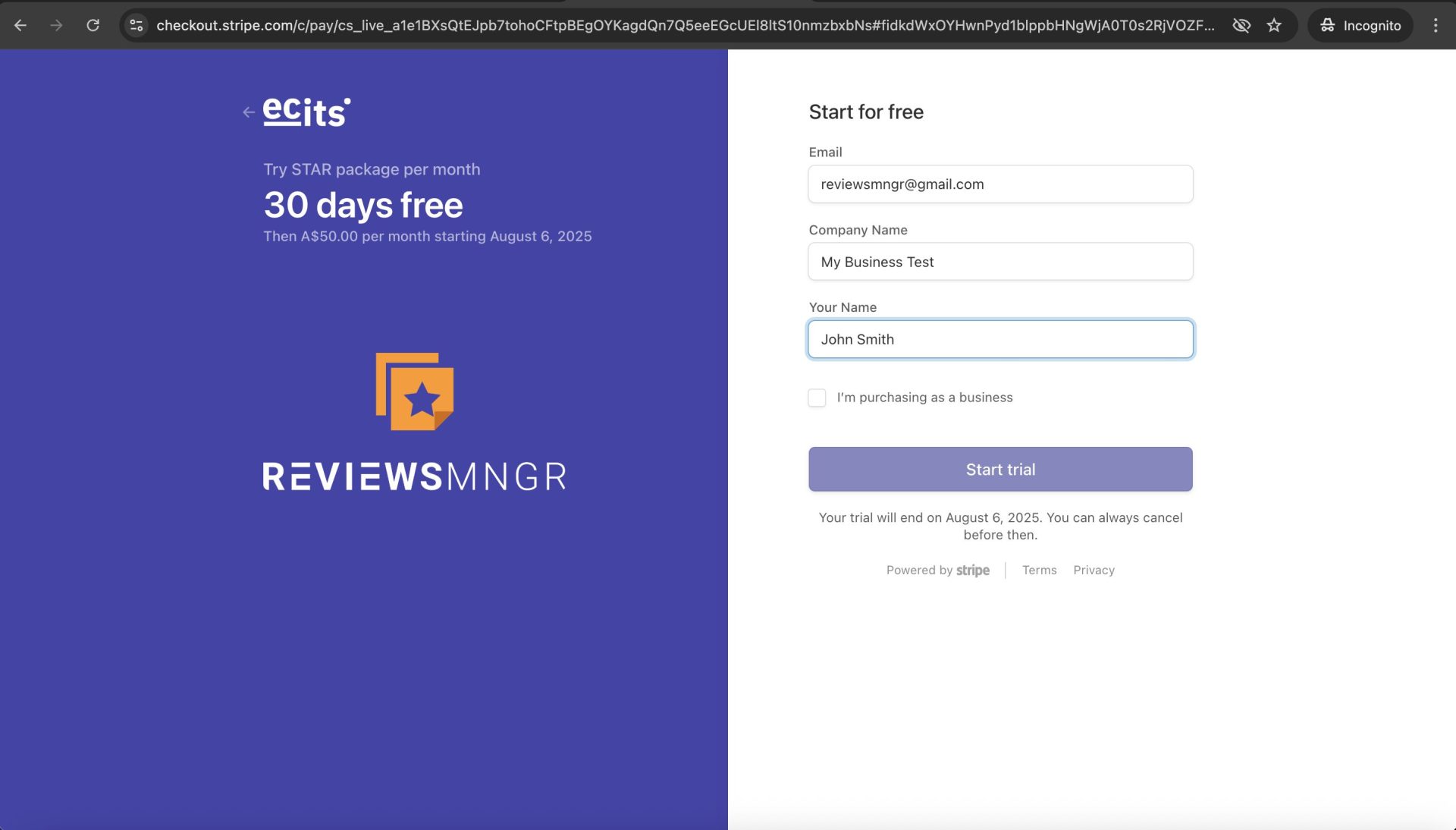 Fill in Name, Email & Business Name. That’s it—no payment details needed.